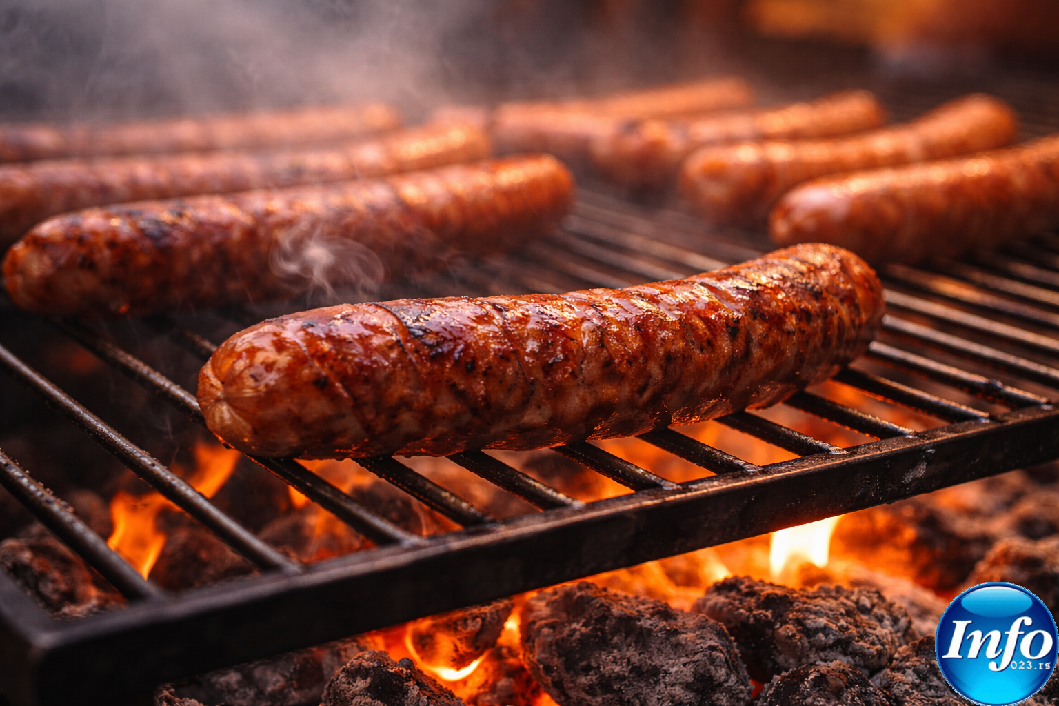 Kobasica na roštilju u krupnom planu – atmosfera festivala u Belom Blatu.