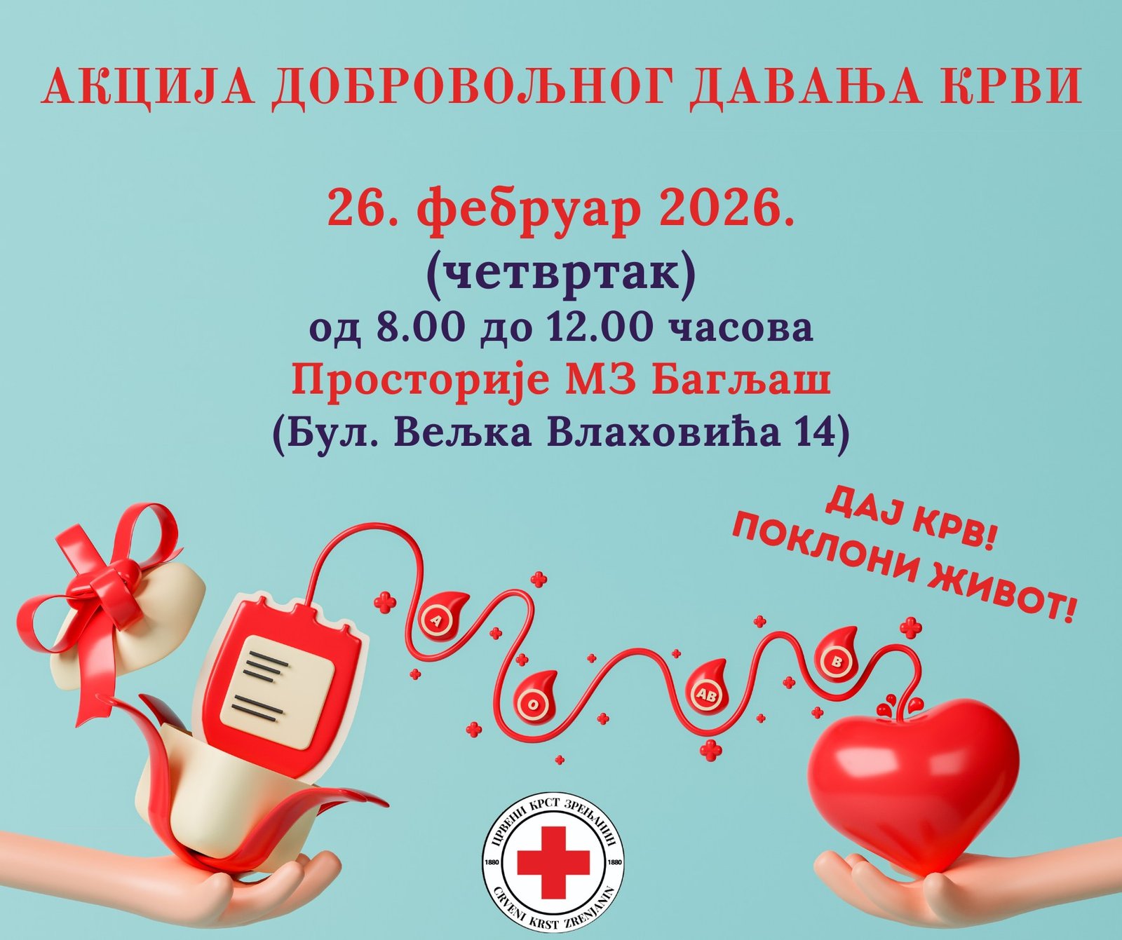 ZRENJANIN – Davanje krvi Bagljaš organizuje Crveni krst Zrenjanin danas, u četvrtak, 26. februara 2026., od 8 do 12 časova. Akcija se sprovodi u prostorijama Mesne zajednice Bagljaš.