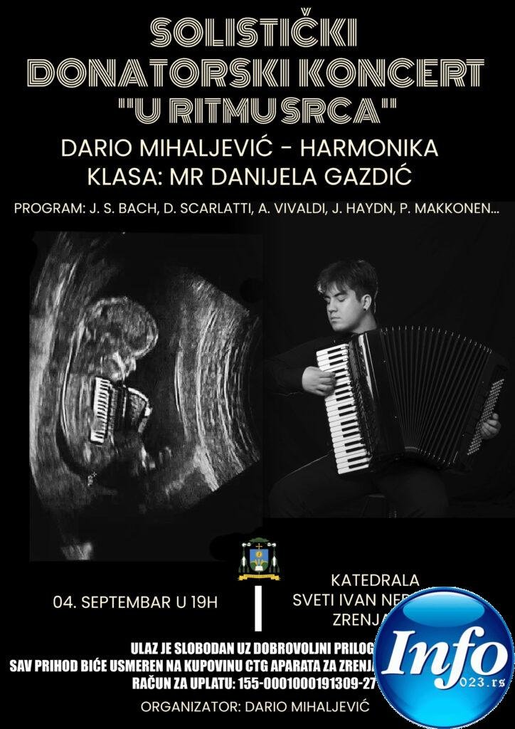 U četvrtak, 4. septembra 2025. godine, sa početkom u 19:00h, u Katedrali Sveti Ivan Nepomuk u Zrenjaninu održaće se humanitarni koncert Darija Mihaljevića, talentovanog harmonikaša i studenta Muzičke akademije. Ovaj događaj ima plemenitu svrhu – prikupljanje sredstava za kupovinu CTG aparata za zrenjaninsko porodilište.
