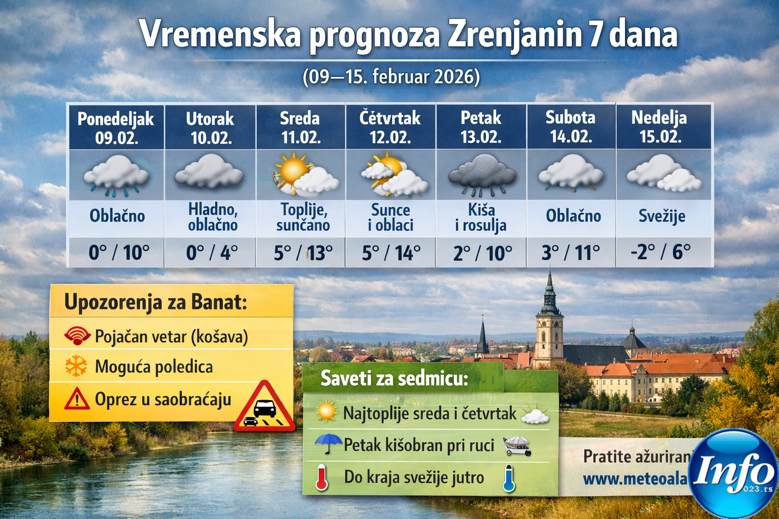 Vremenska prognoza Zrenjanin 7 dana (09–15.02.2026): temperatura, vetar, kiša