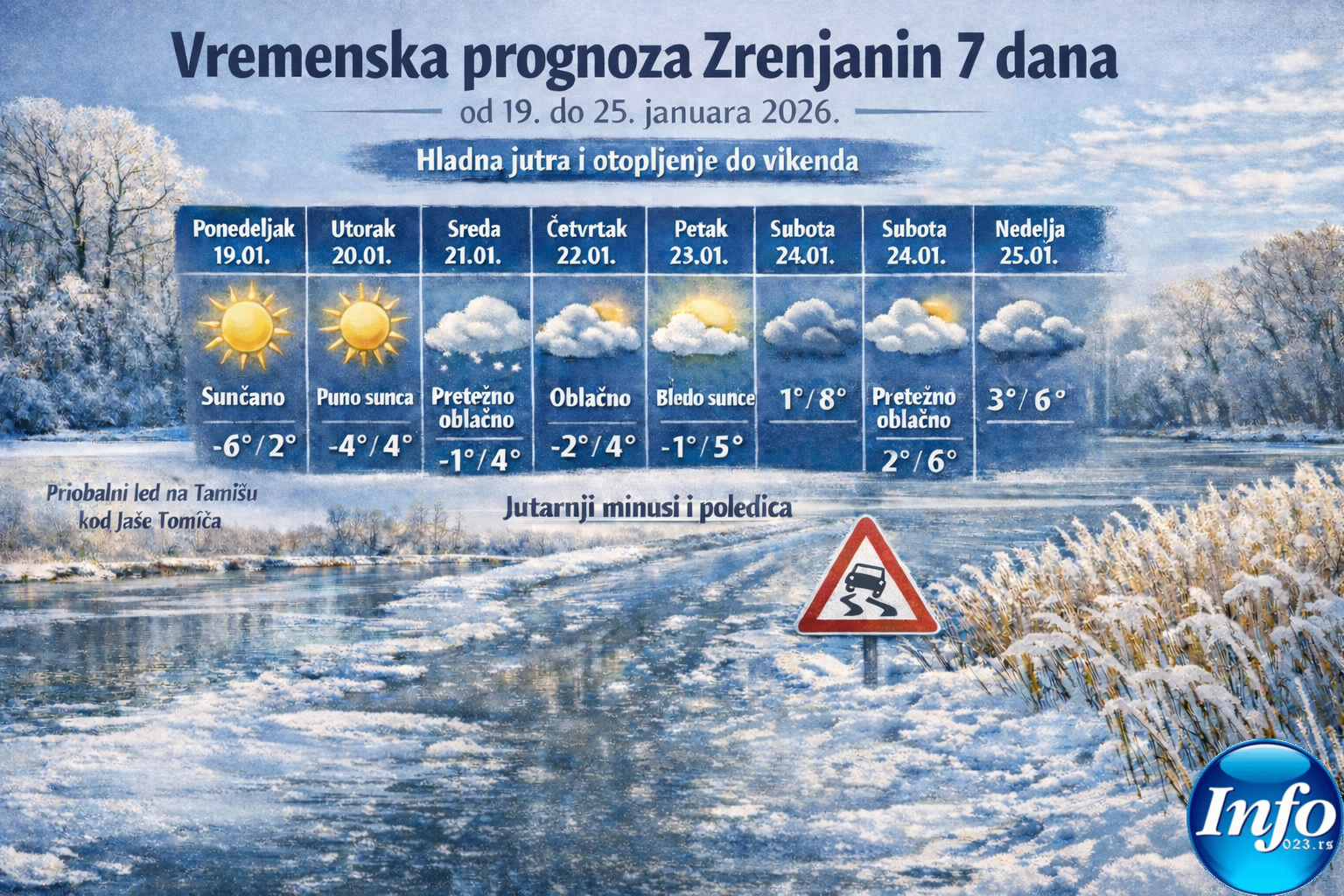 „> Vremenska prognoza Zrenjanin 7 dana (19–25. januar 2026) – hladna jutra i otopljenje do vikenda